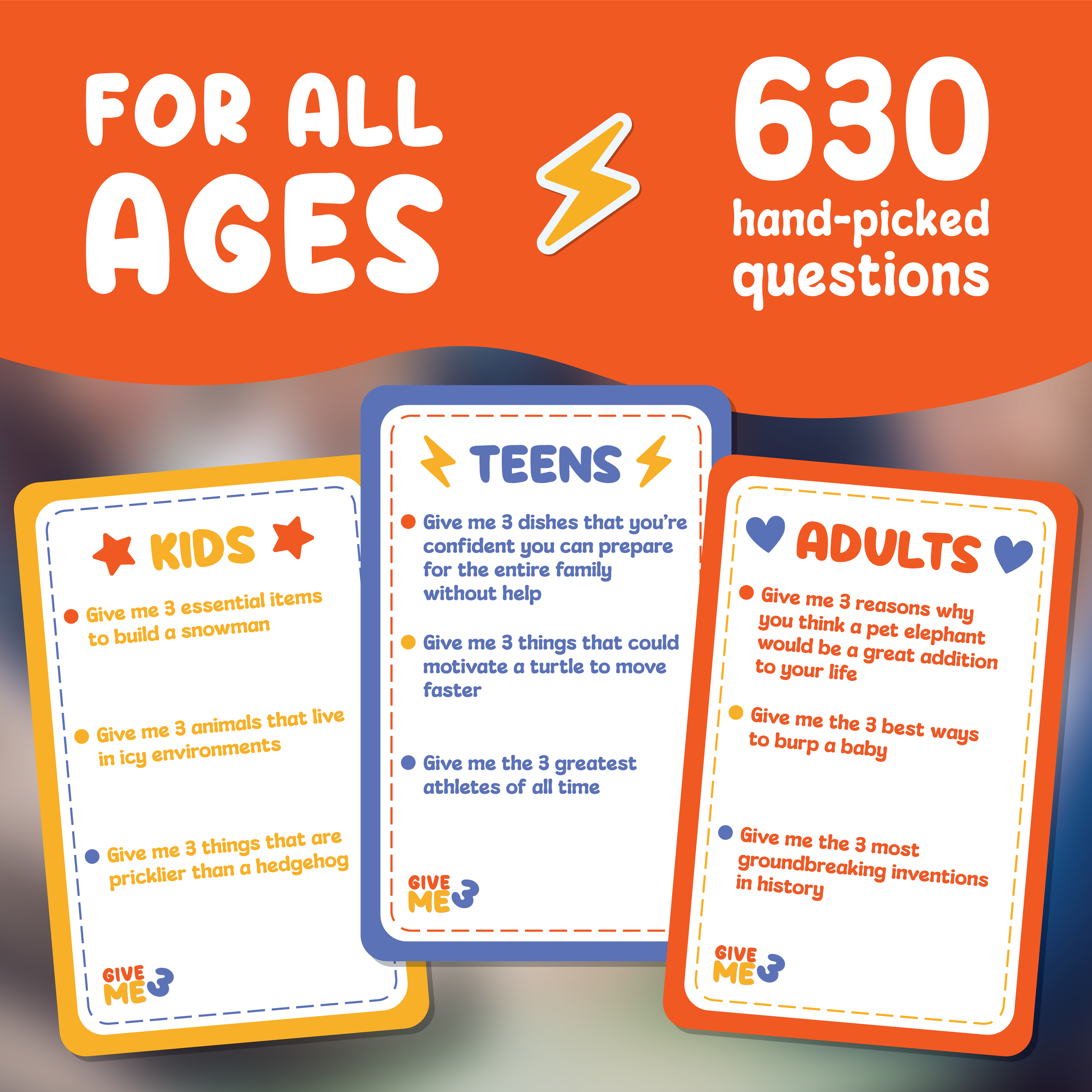 🎉 GIVE ME 3 Family is a fun trivia game for kids, teens and adults that will make the whole family laugh!